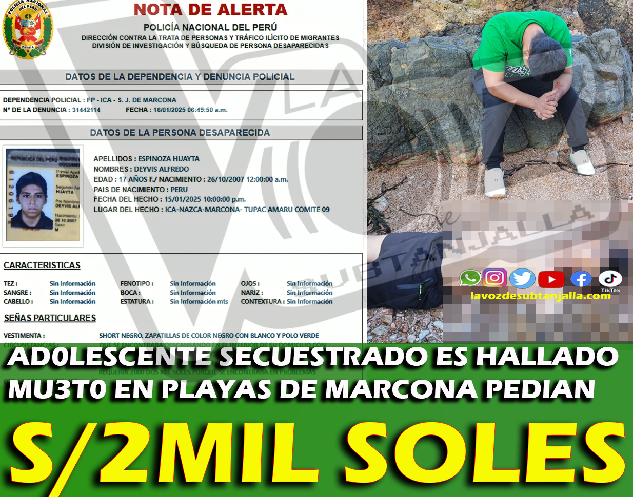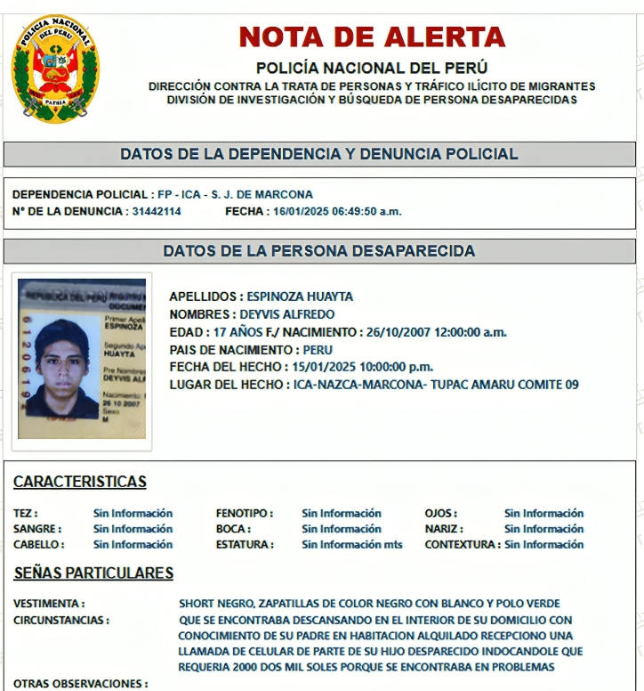 ADOLESCENTE SECUESTRADO FUE HALLADO SIN VIDA EN UNA PLAYA DE MARCONA