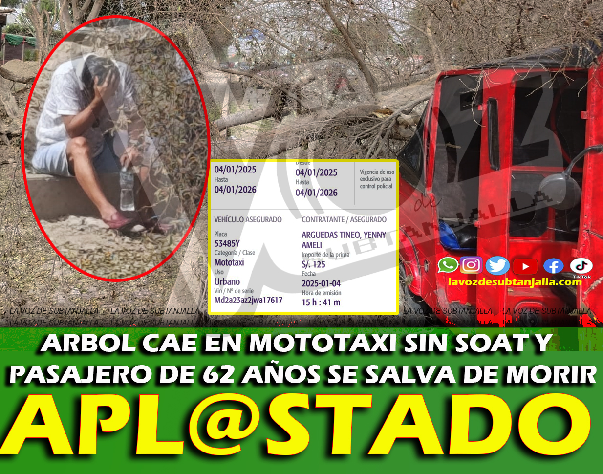 Hoy por la tarde, la Avenida Cutervo, que se ha vuelto intransitable para los vehículos debido a los trabajos en curso, casi se convierte en un escenario de tragedia. Un pesado árbol, ubicado frente al colegio Antonia Moreno de Cáceres, cayó sobre una mototaxi que circulaba por la zona, «aplastando» una mototaxi y dejando al pasajero, Don Paulino Araujo Gómez, de 62 años, gravemente herido.