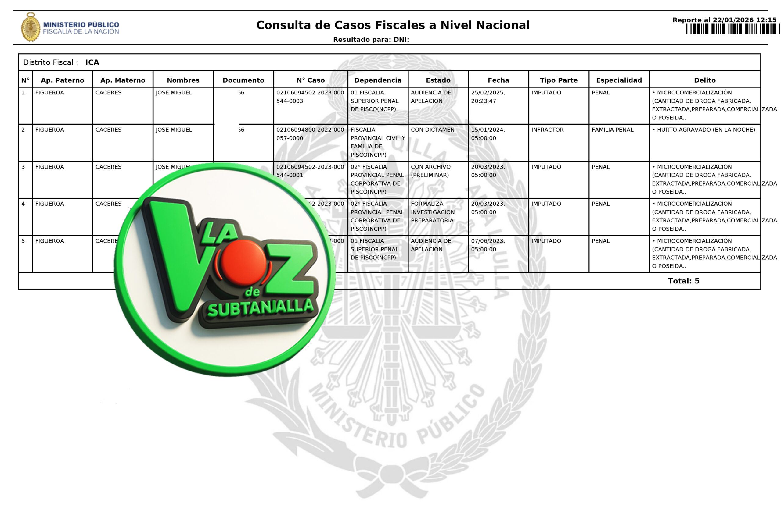 El sujeto contaba con dos requisitorias vigentes: la primera, solicitada por el Primer Juzgado de Investigación Preparatoria de Pisco con fecha 22 de junio de 2024 y expediente número 763-2023; y la segunda, emitida por el Juzgado Colegiado de Chincha con fecha 9 de octubre de 2024, ambas por delito de violación sexual a menor.