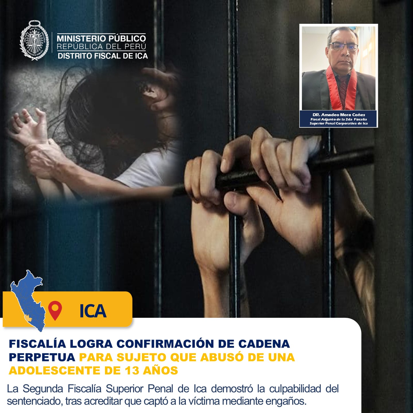 La Segunda Fiscalía Superior Penal de Ica ha conseguido la confirmación de la sentencia de cadena perpetua contra Wilmer Dávila Gutiérrez, de 46 años, quien fue hallado responsable del delito de violación sexual de menor de edad, en agravio de una joven de 13 años.