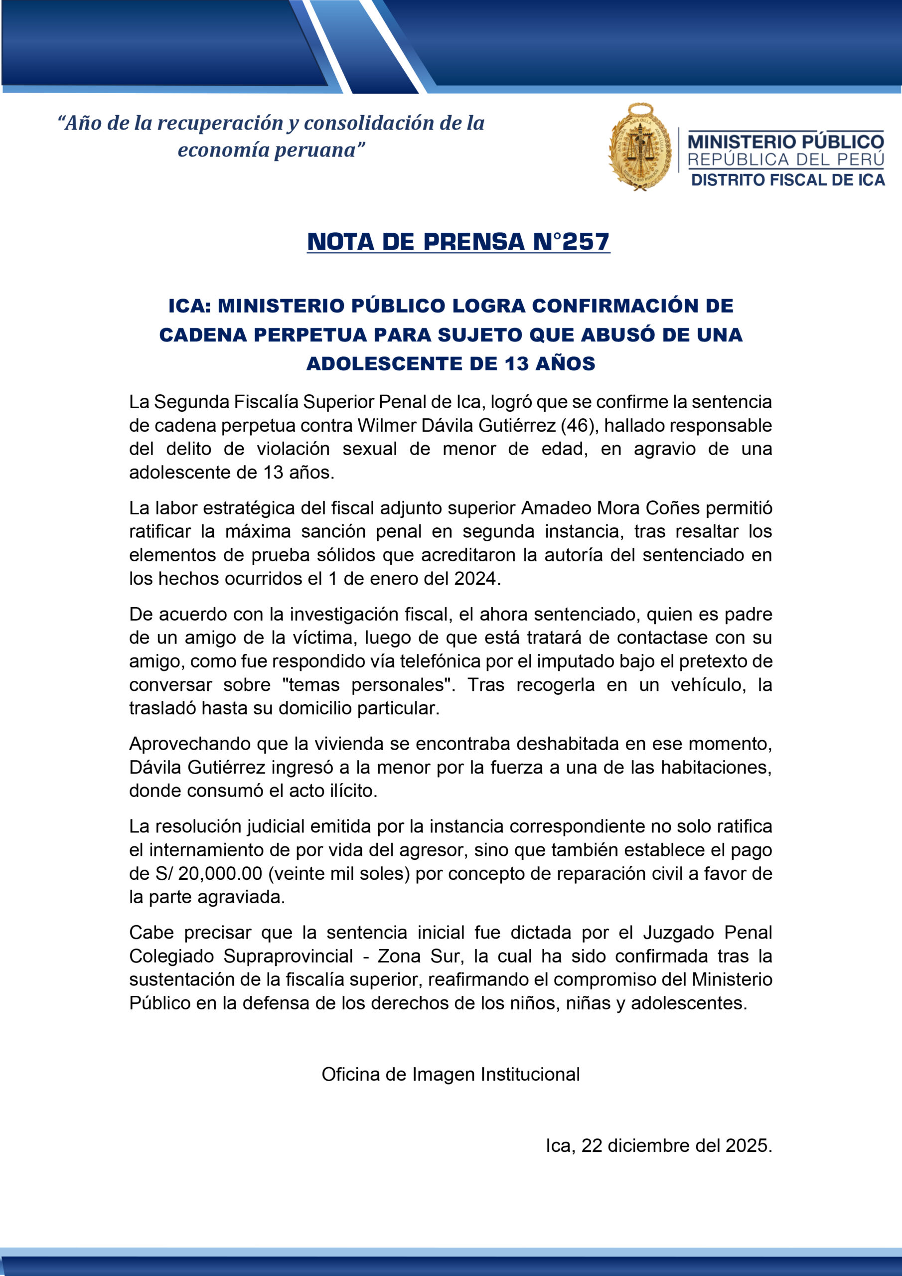 La resolución judicial no solo confirma el internamiento de por vida del agresor, sino que también establece el pago de S/ 20,000.00 como reparación civil a favor de la parte agraviada. La sentencia inicial fue emitida por el Juzgado Penal Colegiado Supraprovincial – Zona Sur y ha sido ratificada tras la sólida sustentación de la fiscalía superior, reafirmando así el compromiso del Ministerio Público en la defensa de los derechos de los niños, niñas y adolescentes.