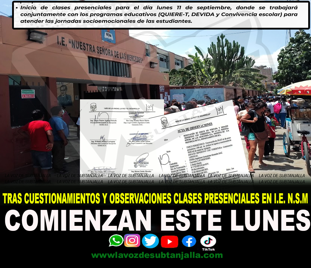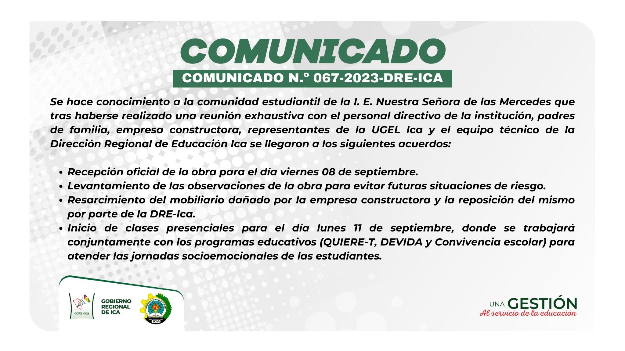 Tras duros cuestionamientos por parte de padres de familia por la demora en la entrega de la obra realizada en la institución educativa nuestra señora de las mercedes , la dirección regional de educación mediante comunicado 067-2023-DREI-ICA , emitido el 7 de setiembre , indica que las clases presenciales en la institución será a partir del día lunes 11 , y que las observaciones serán levantadas .