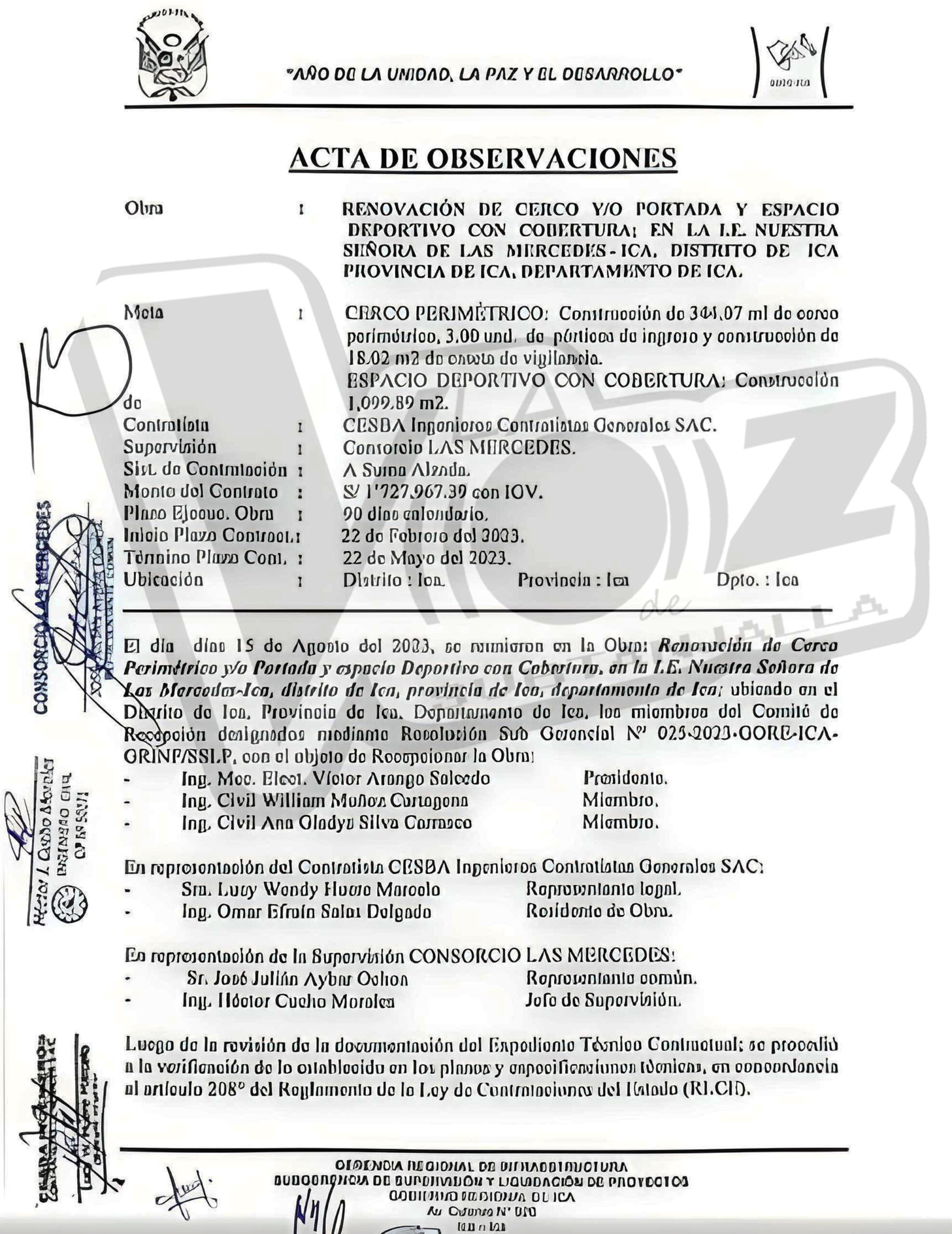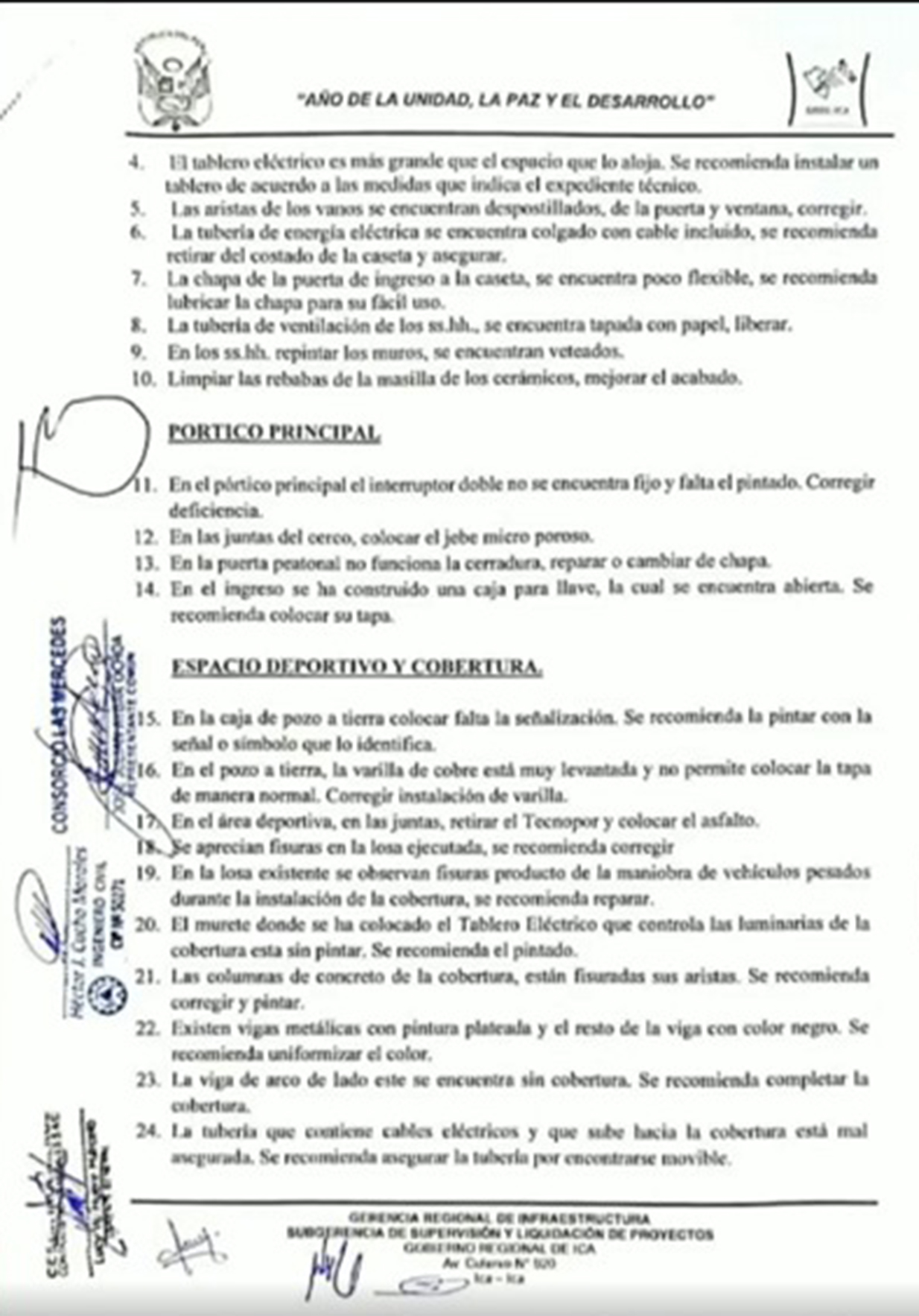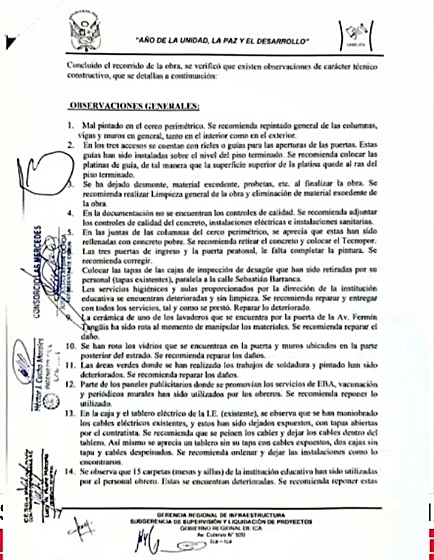Dichas observaciones fueron comunicadas mediante acta del día 15 de agosto del presente año , donde se muestran mas de 30 observaciones , de los que destacan algunos :