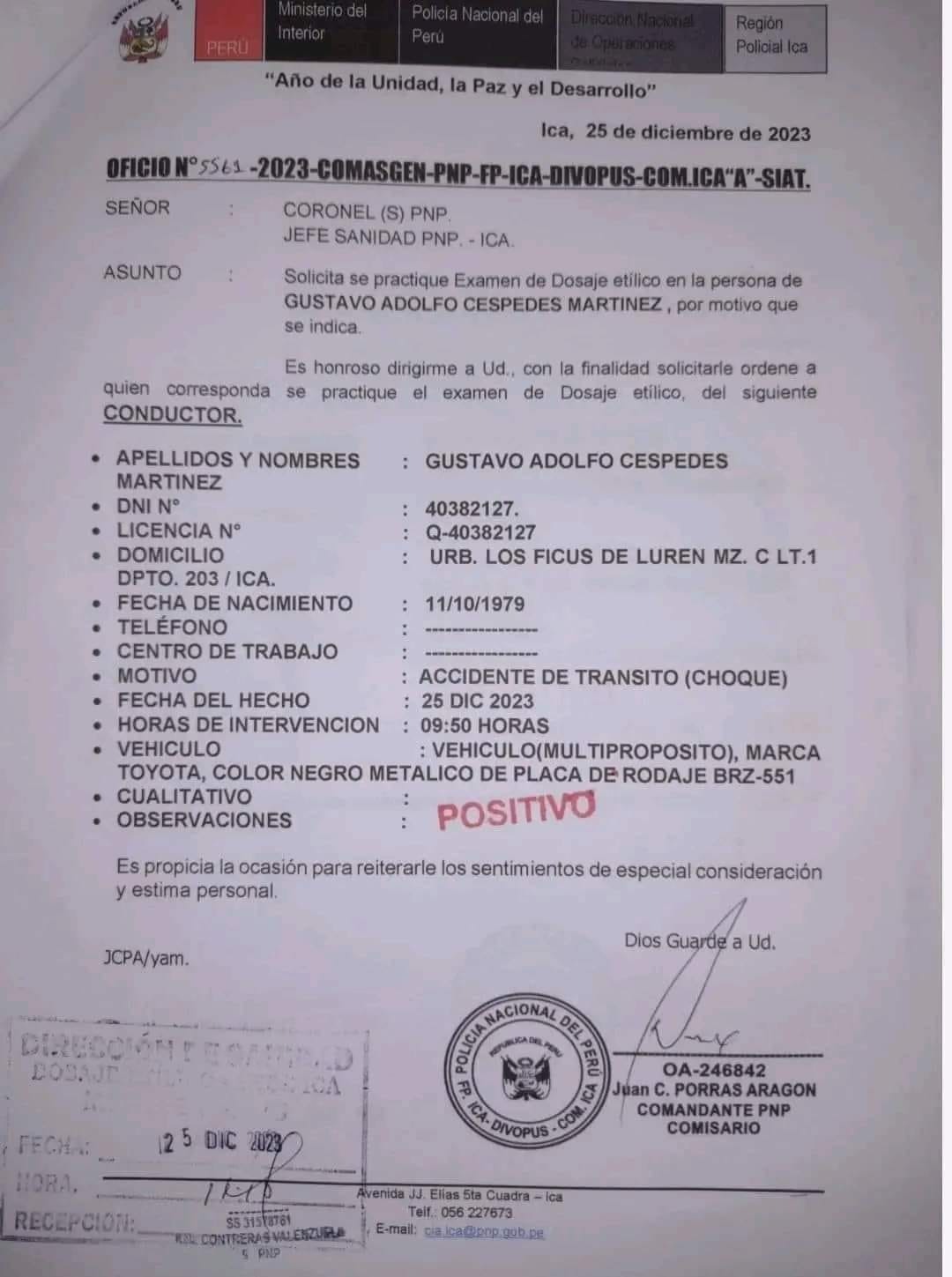 Los efectivos continuaron con las diligencias y a unos 20 metros observaron una camioneta de placa de rodaje BRZ-551, color negro metálico, modelo Rush, estacionada al lado derecho de la calzada. Esta unidad era conducida por el director de la DRE Ica, Gustavo Adolfo Céspedes Martínez (57), a quien los efectivos le preguntaron sobre los hechos ocurridos, no obteniendo respuesta. En el acta policial se indica que Céspedes Martínez descendió del interior de la camioneta y presentaba signos visibles de haber ingerido bebidas alcohólicas (ojos dilatados, titubeaba al hablar y dificultades al caminar).