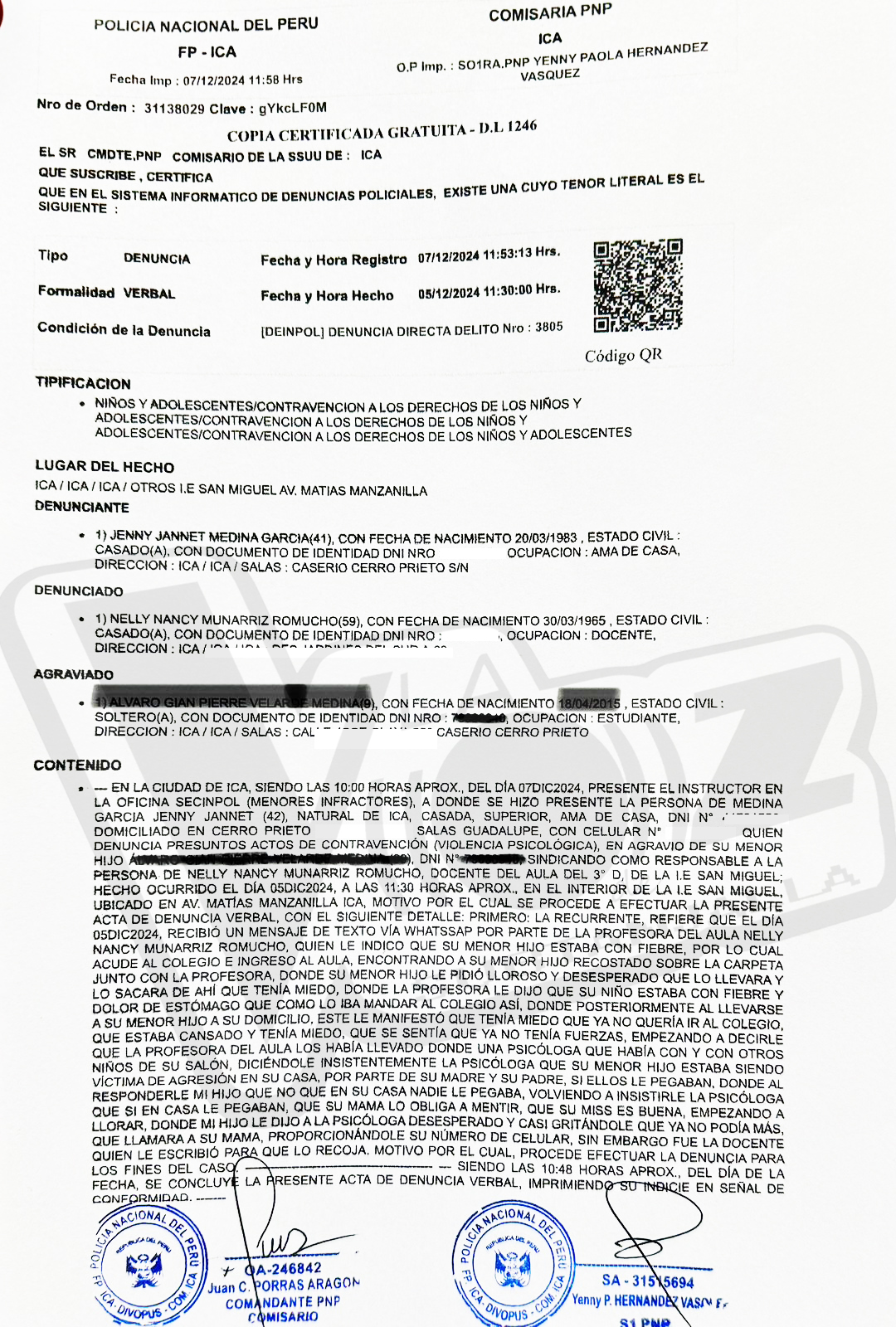 DENUNCIA  FUE PRESENTADA EN LA COMISARIA DE ICA