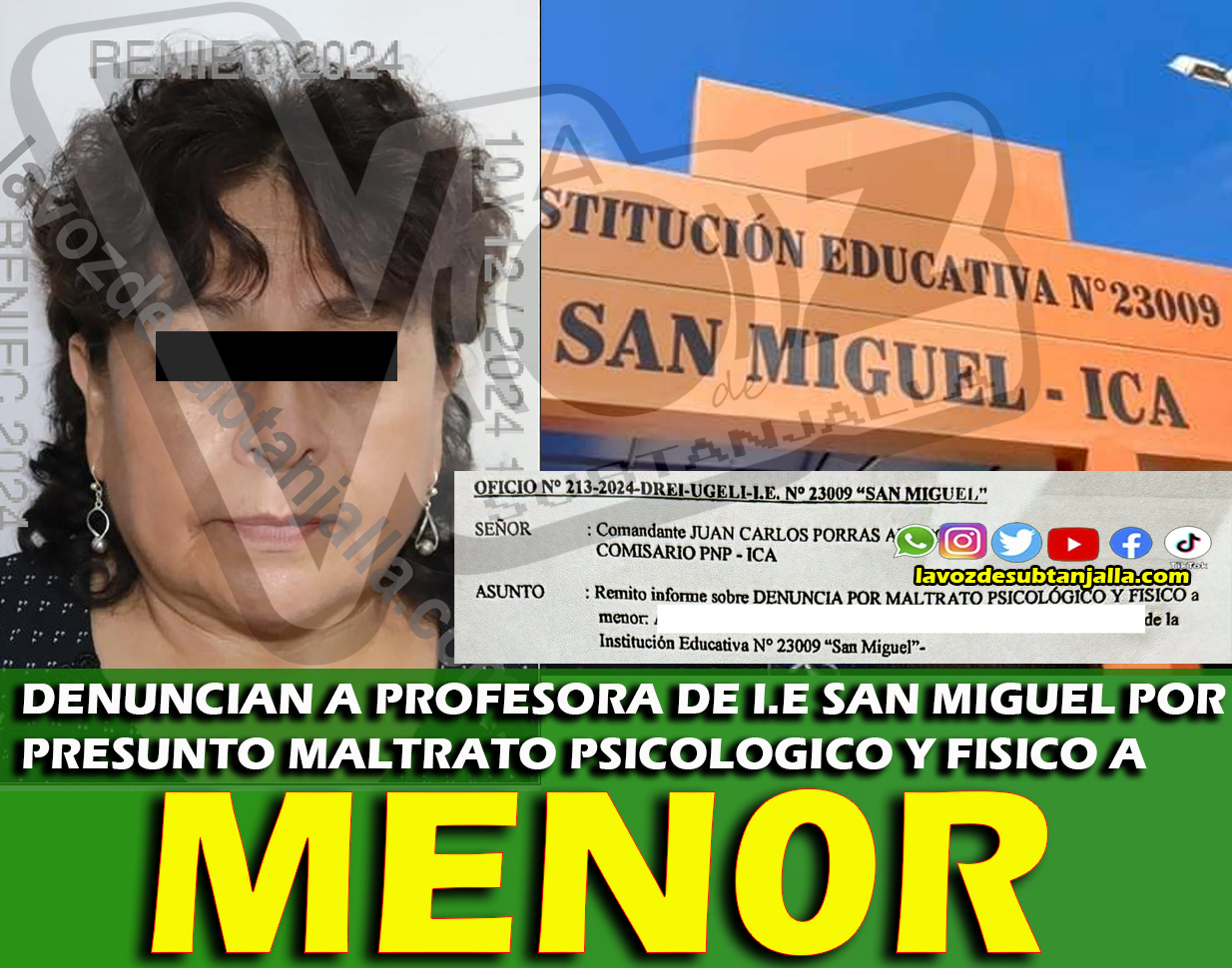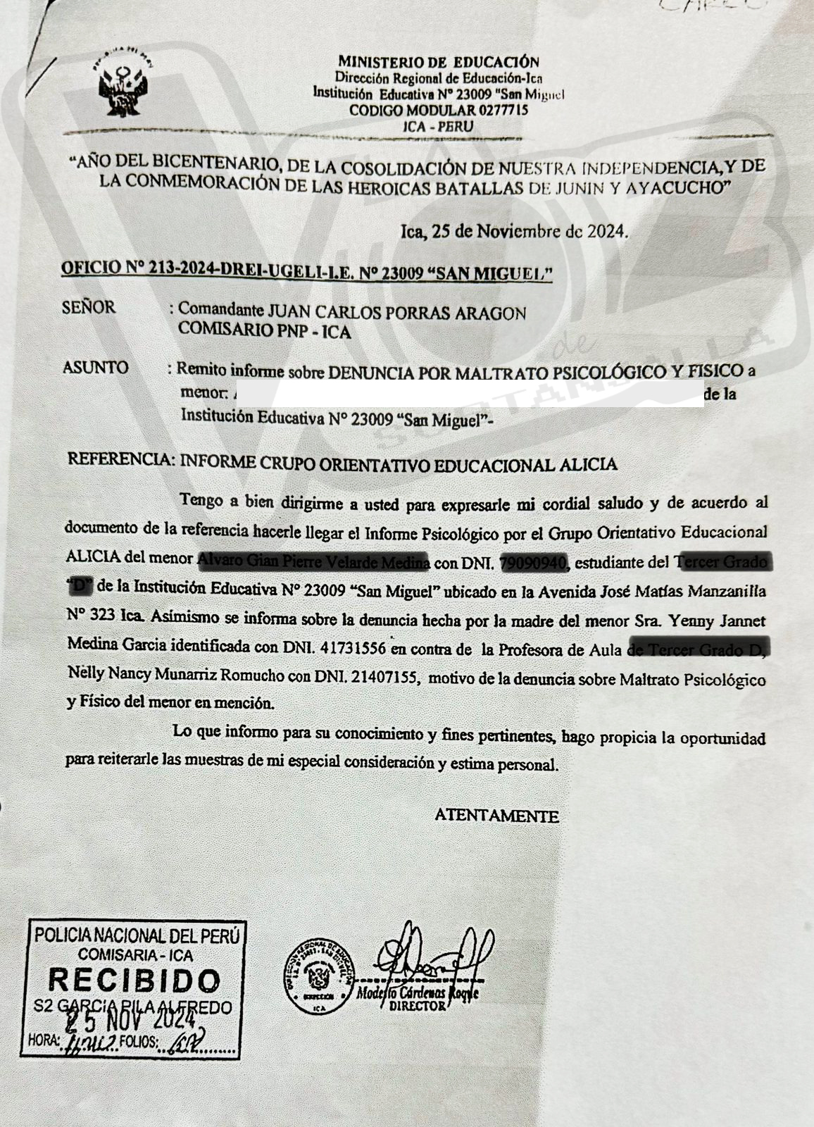 Además, el director de la institución , remitió un informe sobre la situación mediante el oficio número 213-2024 DREI-UGEL IEE número 23 009 San Miguel, dirigido al comandante Juan Carlos Porras Aragón, comisario de la PNP de ICA. Este caso resalta la importancia de abordar el bienestar emocional y psicológico de los estudiantes dentro del entorno escolar, así como la necesidad de investigar a fondo cualquier alegación de maltrato que pueda comprometer su desarrollo integral.