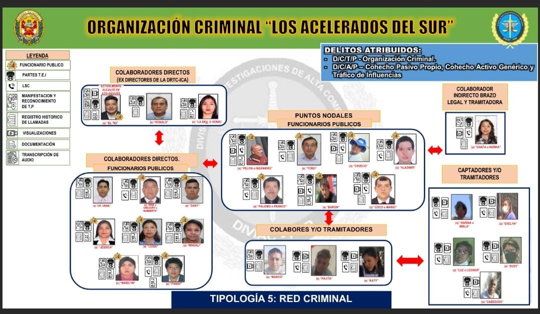 Los implicados enfrentarán cargos por corrupción de funcionarios, cohecho pasivo, cohecho activo y organización criminal. Las autoridades continúan con las diligencias para determinar el alcance total de la red y su impacto en la seguridad vial de la región.