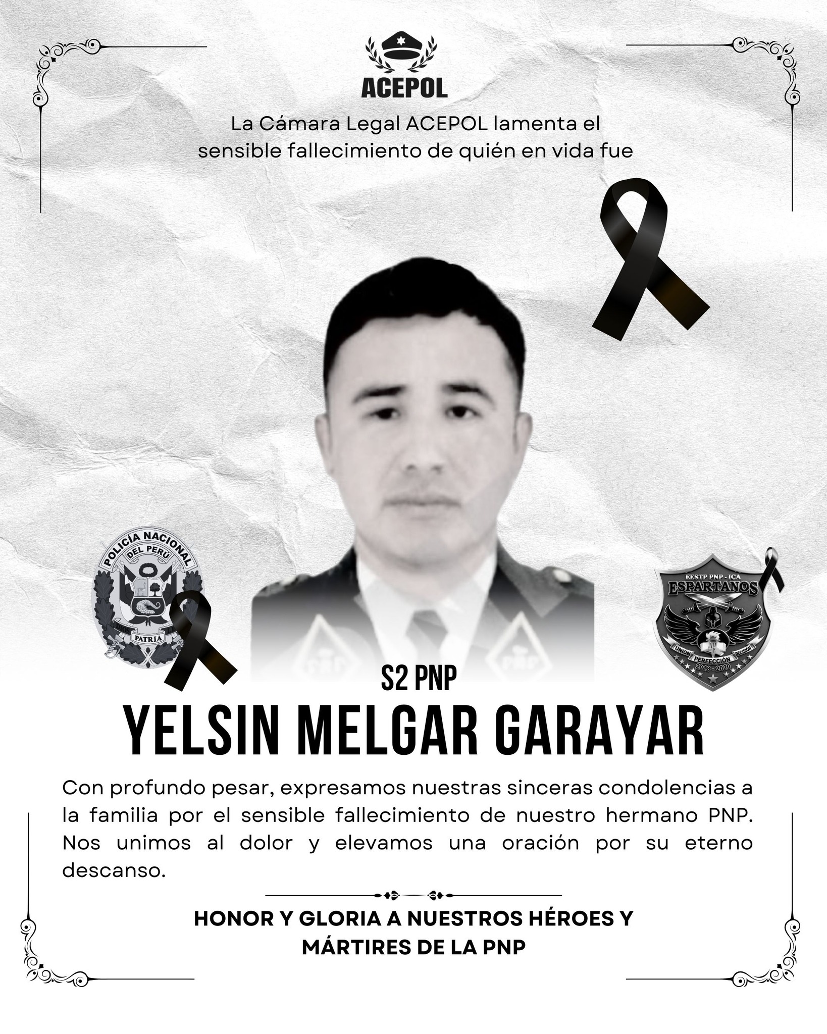Desde ACEPOL expresaron las condolencias por el sensible fallecimiento del S2 Yelsin Melgar Garayar.