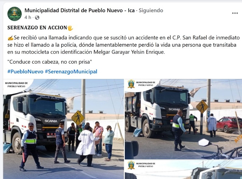 Serenazgo de la municipalidad de Pueblo Nuevo apoyaron el trágico accidente uy recomendaron en sus redes sociales utilizando una frase «CONDUCE CON CABEZA NO CON PRISA «