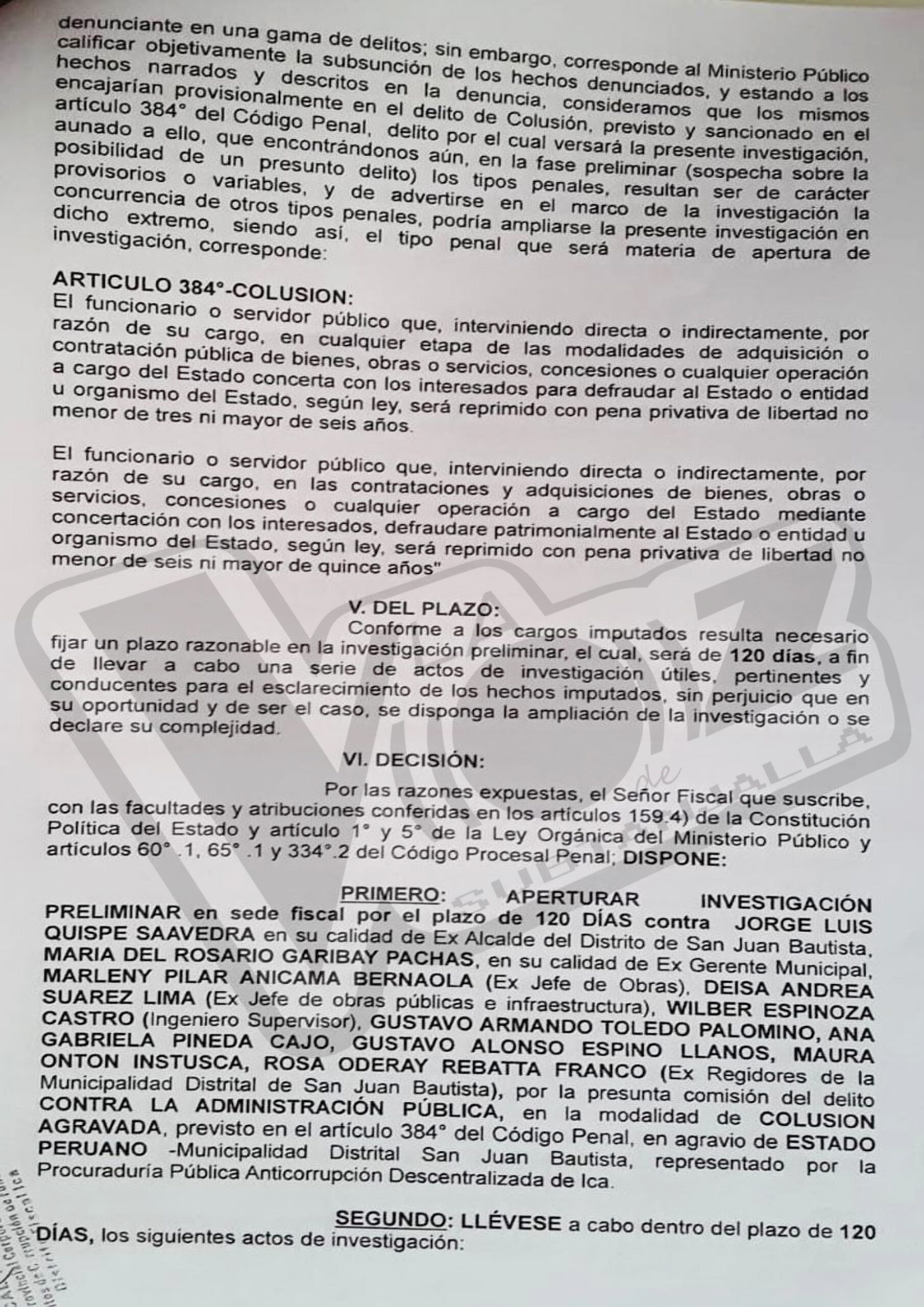 La fiscalía provincial penal corporativa especializada en delitos de corrupción de funcionarios de Ica , aperturó la carpeta fiscal número 21 060 15 500 – 2022 – 226 – 0 , contra el ex y actual alcalde Jorge Luis Quispe Saavedra , así mismo a su personal de confianza en gestión anterior : gerente municipal Marlene anicama bernaola , ex jefe de obras Andrea Suárez , ex jefe de obras e infraestructura Wilber Espinoza Castro , en su calidad de ingeniero supervisor Gustavo Armando Toledo Palomino Ana Gabriela Pinedo Cajo Gustavo Alonso Espino Llanos Mauro Intusca Rosa Rebata en su calidad de ex regidores de la municipalidad distrital de San Juan Bautista por la presunta comisión del delito contra la administración pública en la modalidad de colusión agravada previsto en el artículo 384 del Código Penal y otros en agravio del Estado peruano.