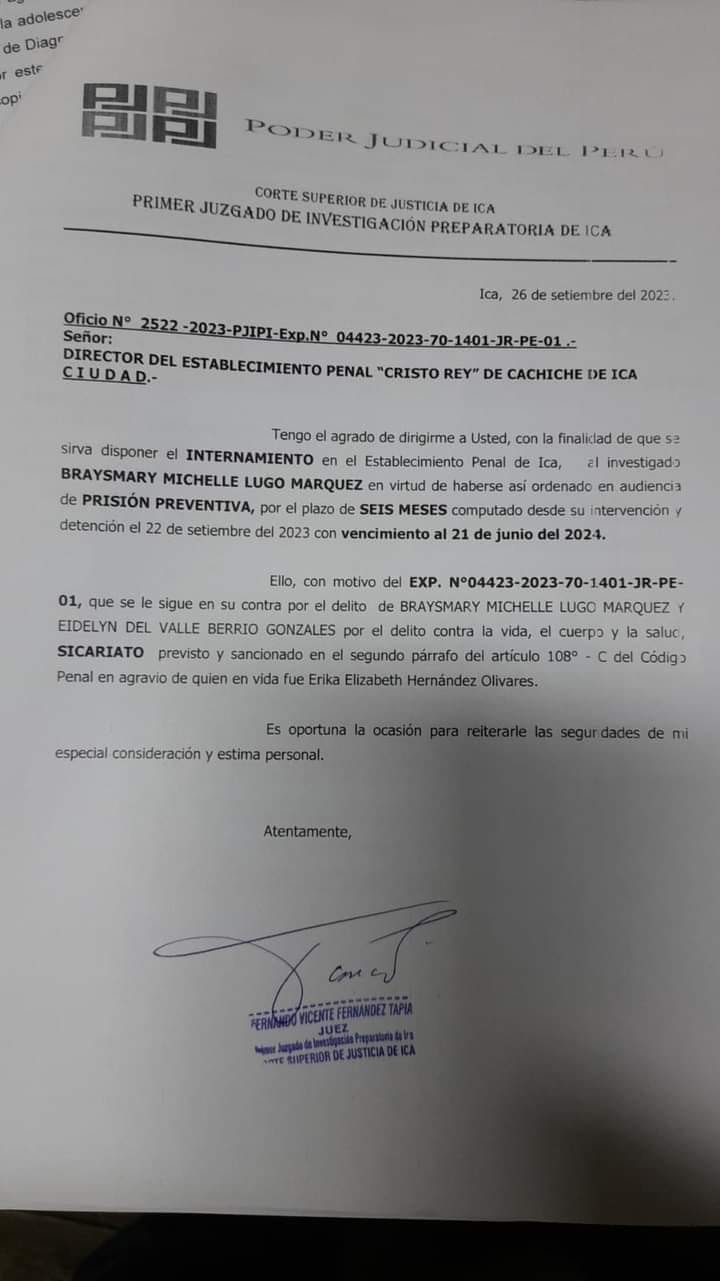 En tanto, el Tercer Juzgado de Familia de Ica dictaminó cuatro meses de internamiento preventivo a la menor de iniciales I.Y B.R. de 16 años, por infracción a la ley penal por el presunto delito de sicariato.