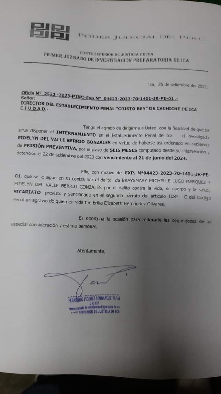 El Poder Judicial dictó nueve meses de prisión preventiva en contra de las venezolanasBraysmary Michelle Lugo Martínez de 19 años y Eidelyn del Valle Berrío Gonzales (19), por el presunto delito contra la vida, el cuerpo y la salud, en la modalidad de sicariato, mientras que otra menor de 16 años fue internada por cuatro meses de manera preventiva. Las ciudadanas estarían involucradas en el asesinato de la joven Ericka Hernández Olivares (28).
