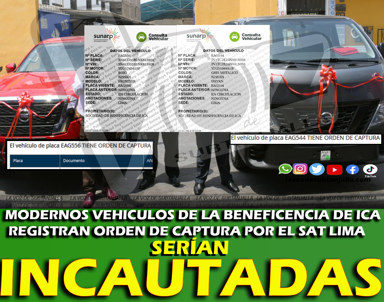 MODERNAS CAMIONETAS PERTENECIENTES A LA SOCIEDAD DE BENEFICIENCIA DE ICA , A PUNTO DE SER INCAUTADA POR EL SAT DE LIMA , REGISTRA ORDEN DE CAPTURA POR INCUMPLIMIENTO DE PAGOS