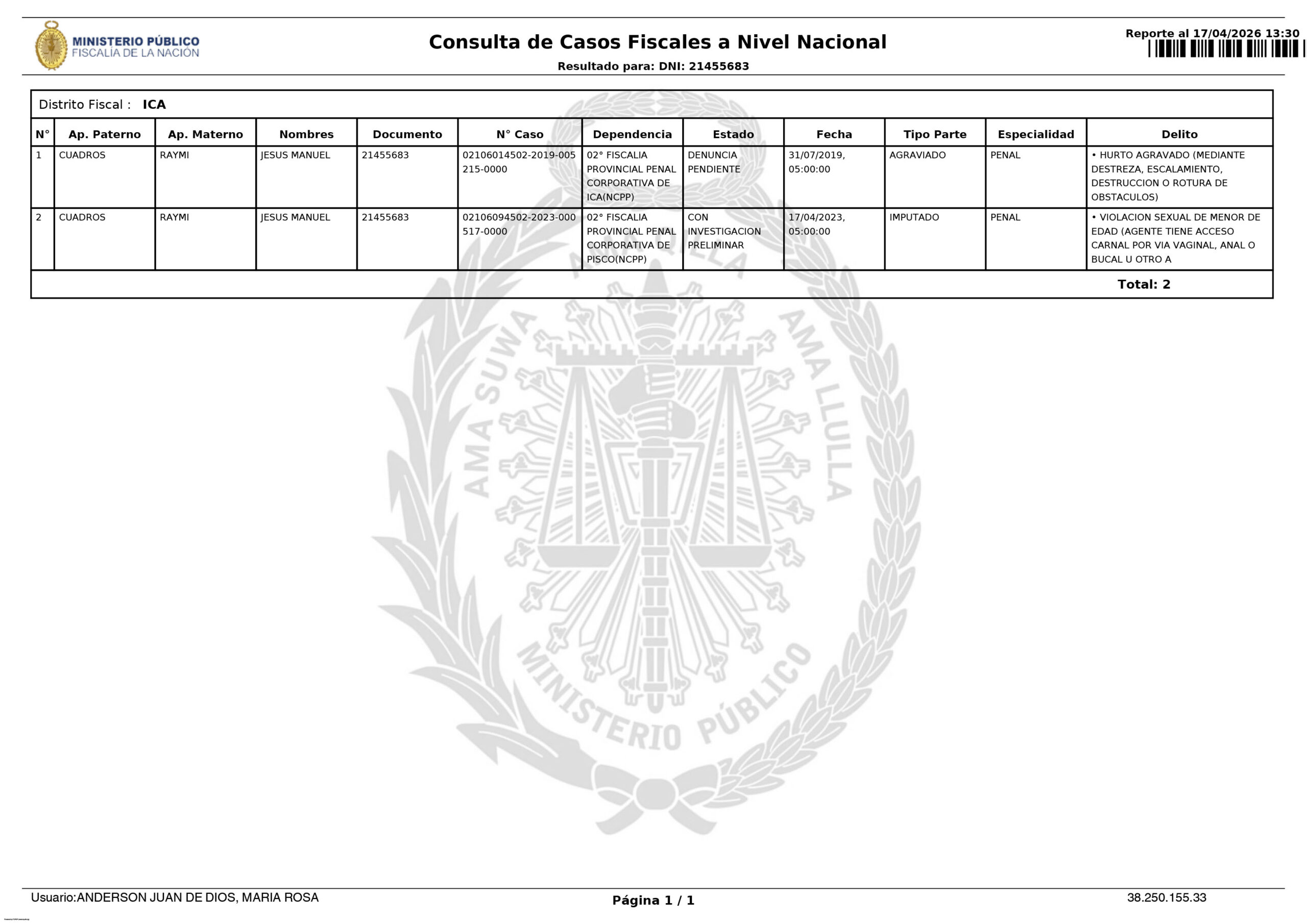El sujeto contaba con dos requisitorias vigentes: la primera, solicitada por el Primer Juzgado de Investigación Preparatoria de Pisco con fecha 22 de junio de 2024 y expediente número 763-2023; y la segunda, emitida por el Juzgado Colegiado de Chincha con fecha 9 de octubre de 2024, ambas por delito de violación sexual a menor.