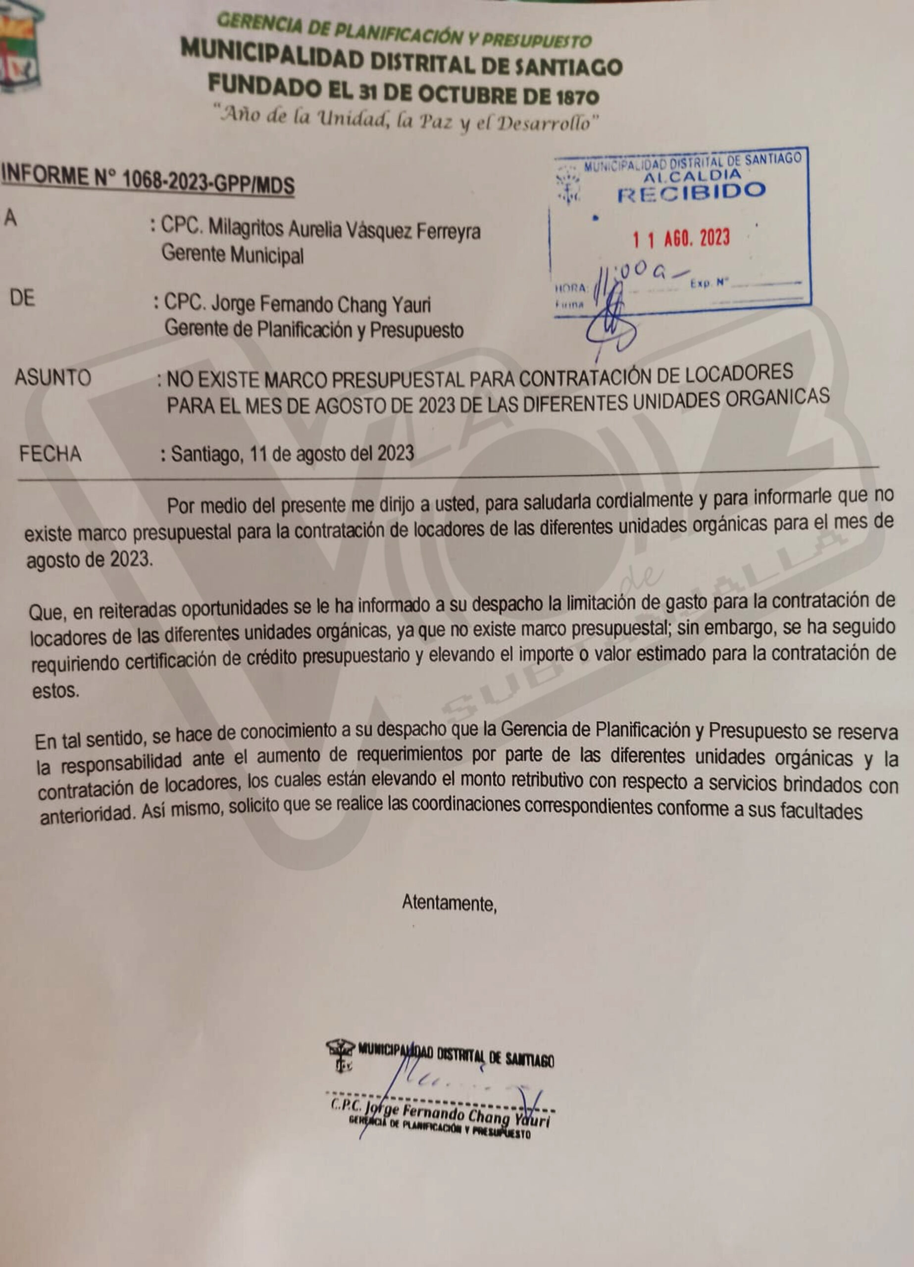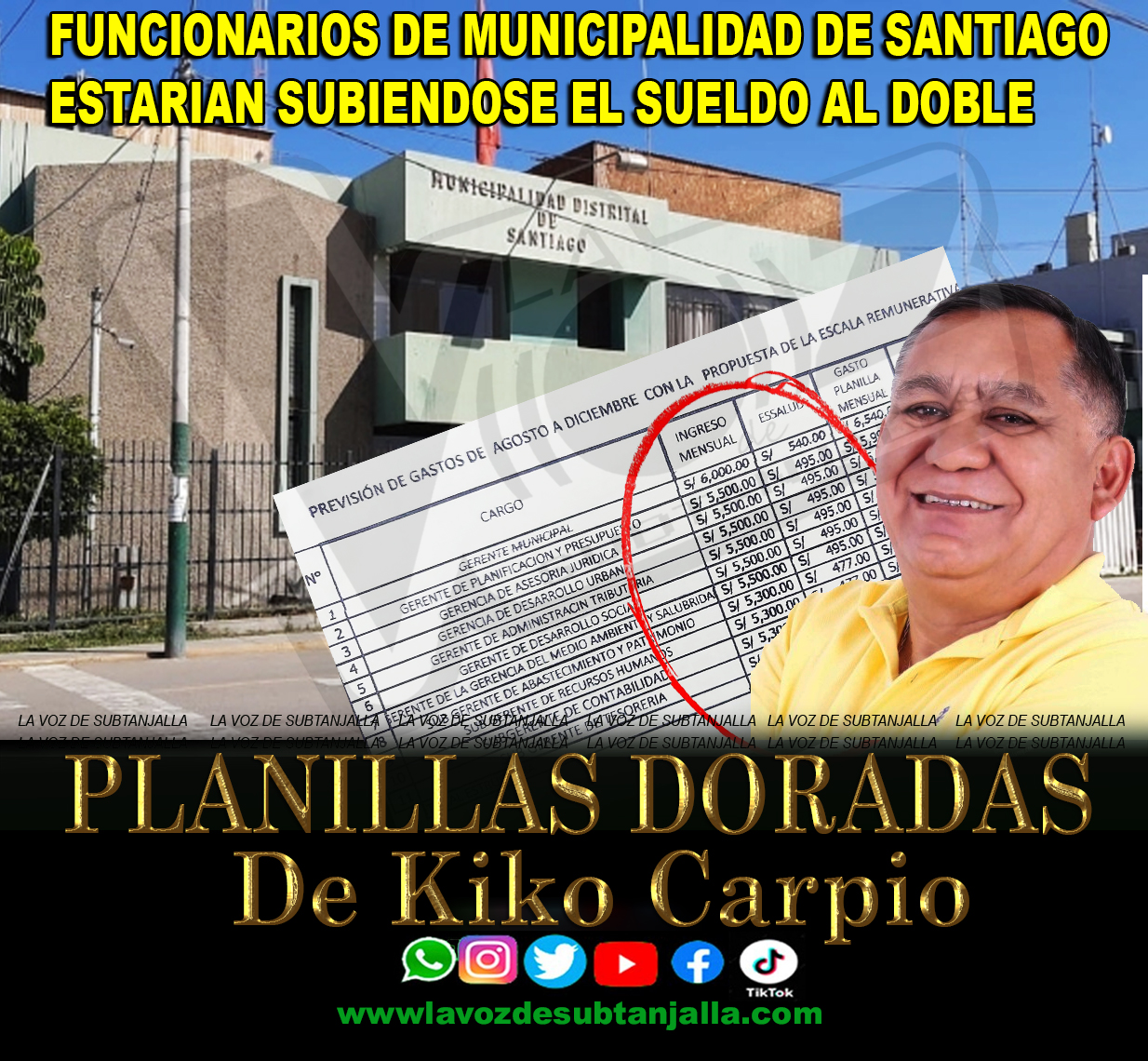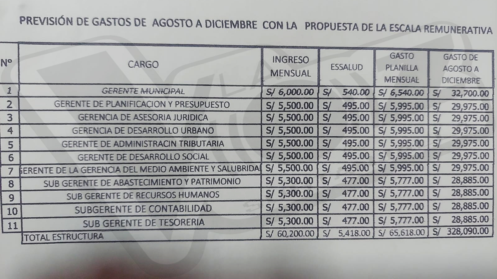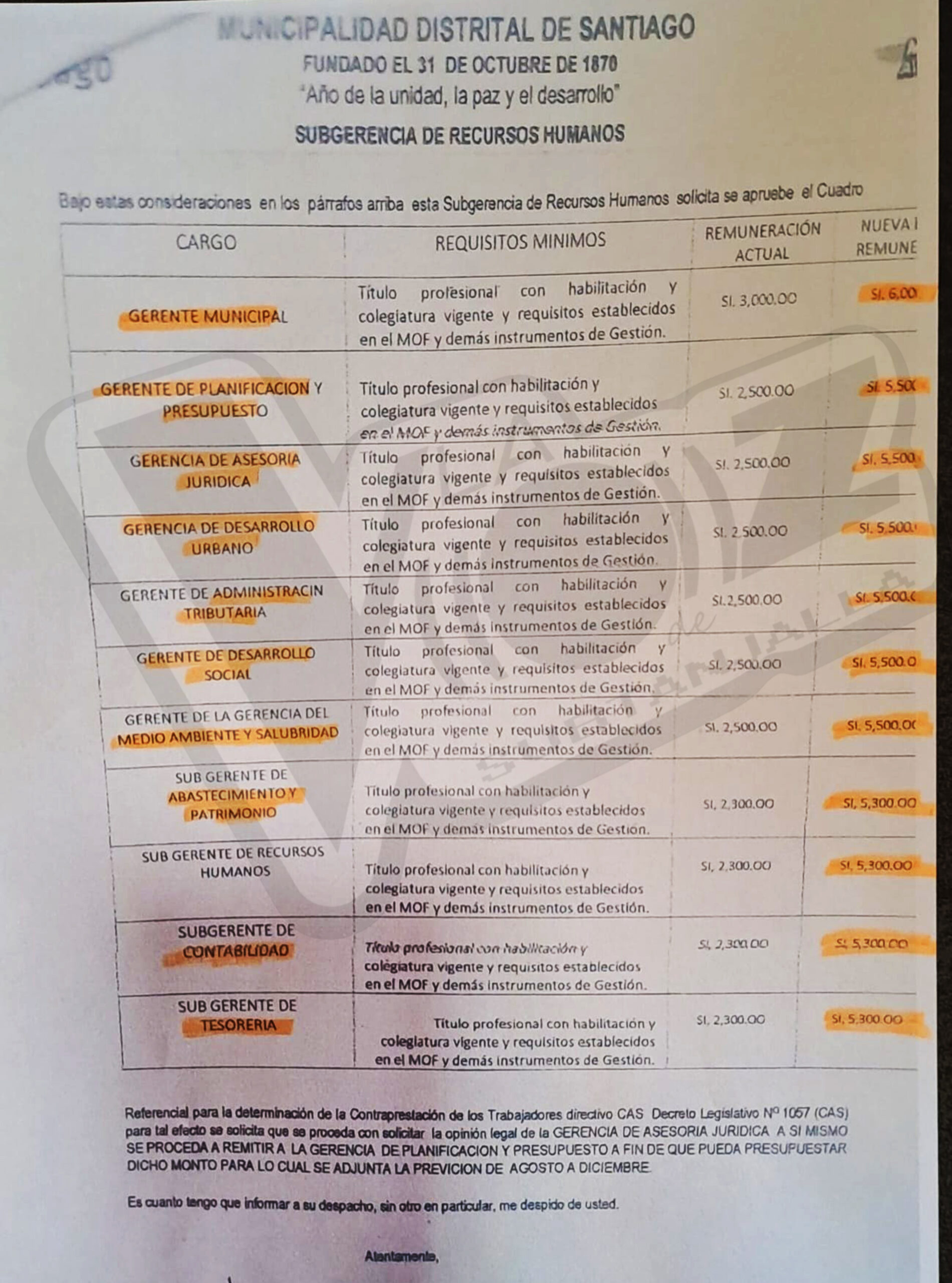 Una planilla solicitada por el subgerente de recursos humanos de la municipal distrital de Santiago muestra los exorbitantes sueldos que van entre los 6,000 y 5 ,500 soles. También se hizo un comparativo con los sueldos de la gestión anterior donde apenas alcanza los 2,500 soles.
