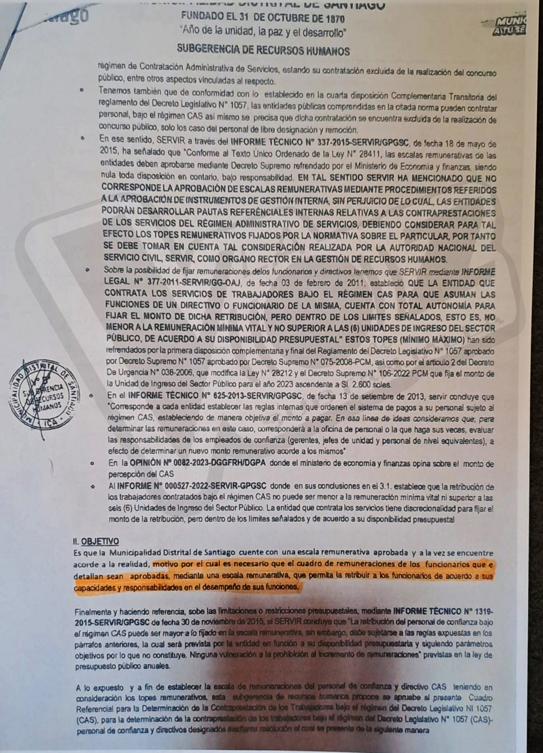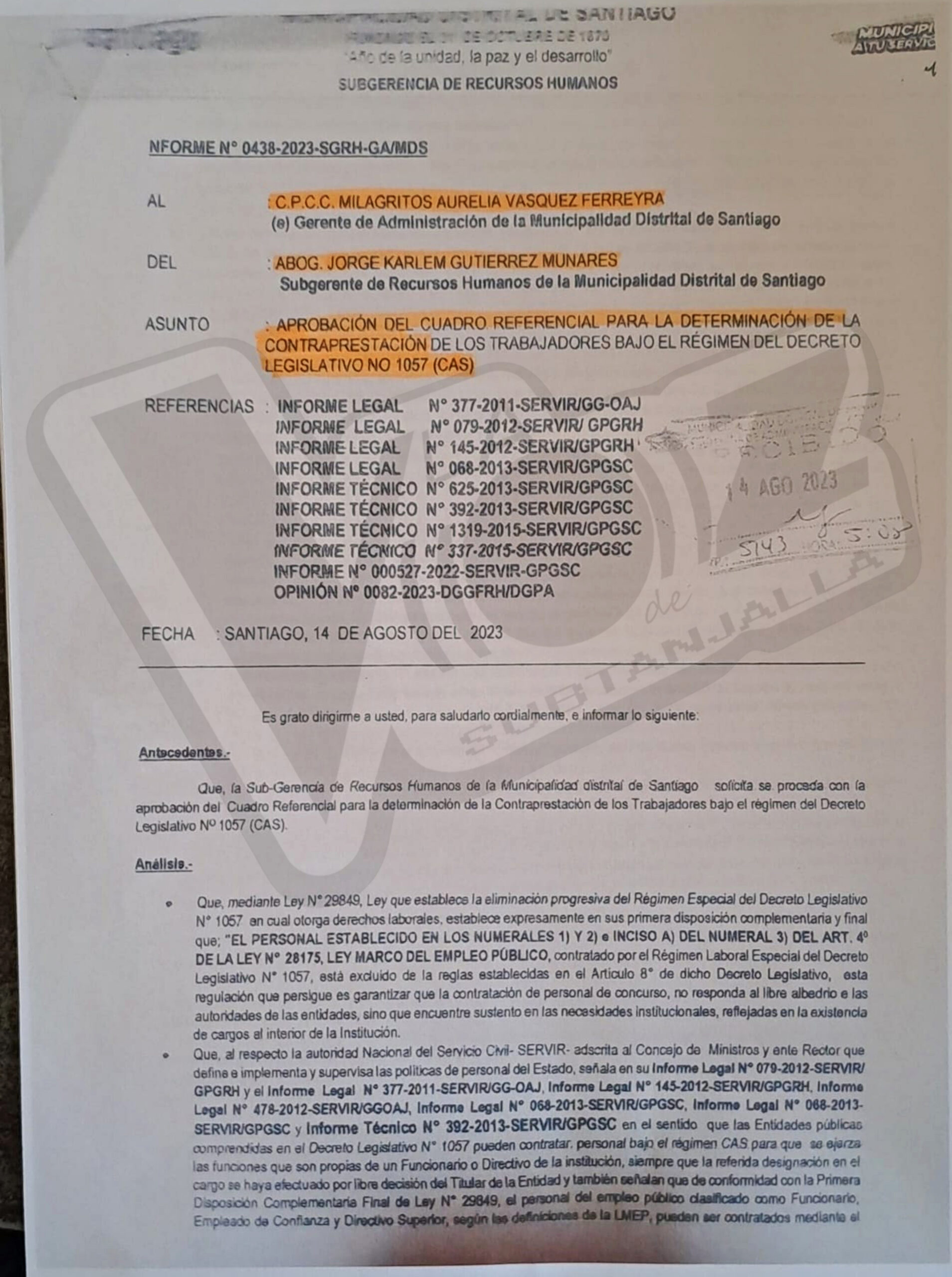 En el informe número 04 38 – 2023 – CGRH-GA/MDS de fecha 14 de agosto del 2023 el abogado Jorge Karlen Gutiérrez Munares , subgerente de recursos humanos de la municipalidad distrital de Santiago envía el documento a la gerencia municipal para la aprobación y solicita se proceda con la aprobación del cuadro referencial para la determinación de la contraprestación de los trabajadores bajo el régimen del decreto legislativo 1057 (CAS ).