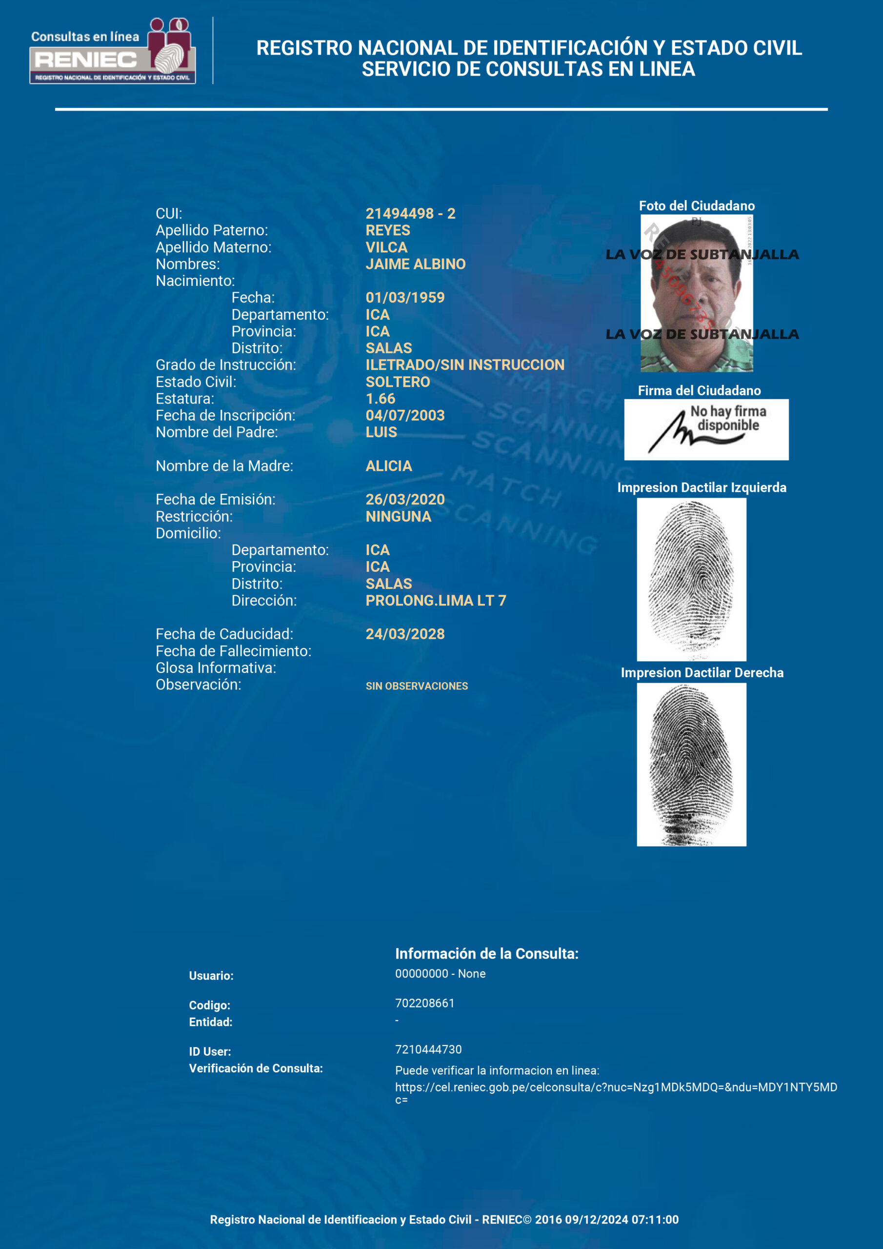El sujeto contaba con dos requisitorias vigentes: la primera, solicitada por el Primer Juzgado de Investigación Preparatoria de Pisco con fecha 22 de junio de 2024 y expediente número 763-2023; y la segunda, emitida por el Juzgado Colegiado de Chincha con fecha 9 de octubre de 2024, ambas por delito de violación sexual a menor.