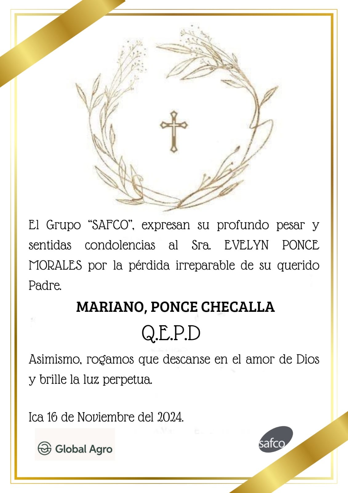 Expresamos nuestras más sentidas condolencias a nuestra compañera Evelyn Ponce Morales por la irreparable pérdida de su querido padre, el Sr. Mariano Ponce Checalla.