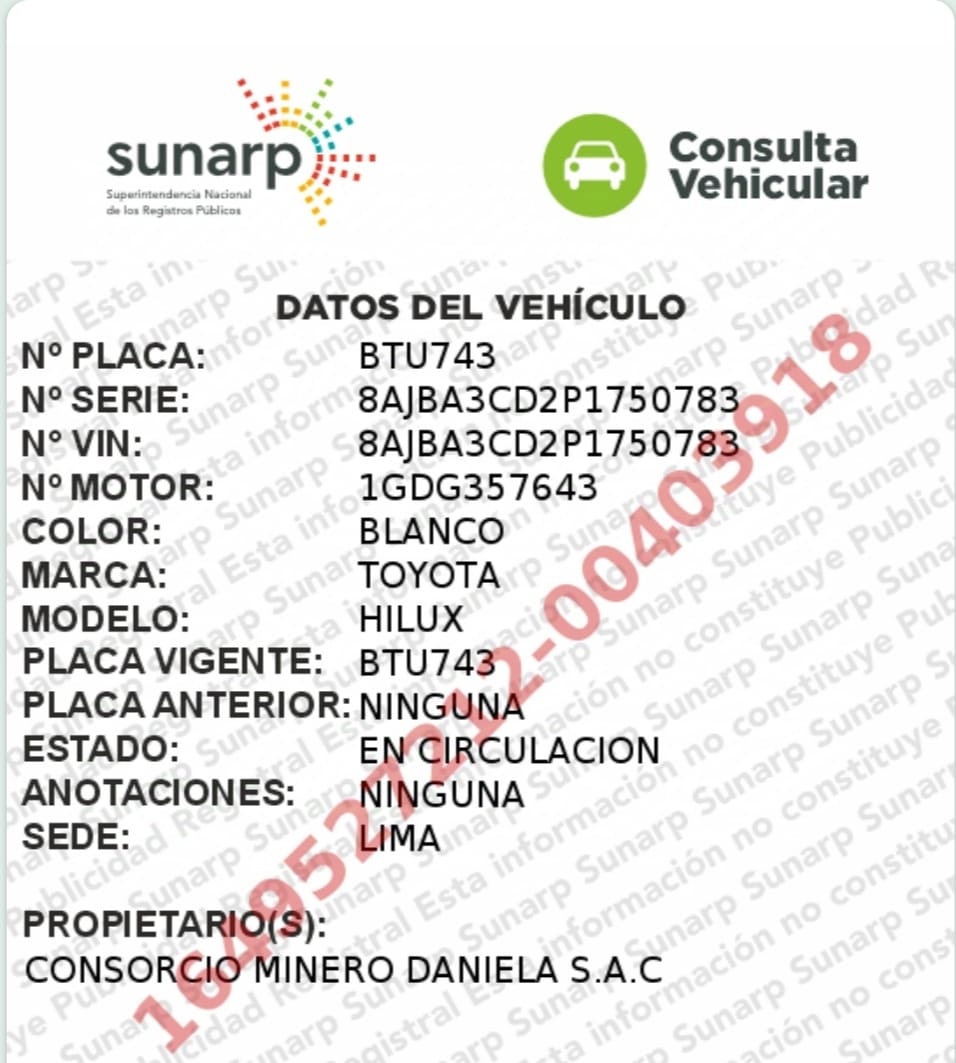 Durante la intervención se incautaron tres equipos celulares y un vehículo de placa B9C-567, marca Brilliance, modelo Zhonghua, color rojo, que habría sido utilizado para facilitar el accionar delictivo.